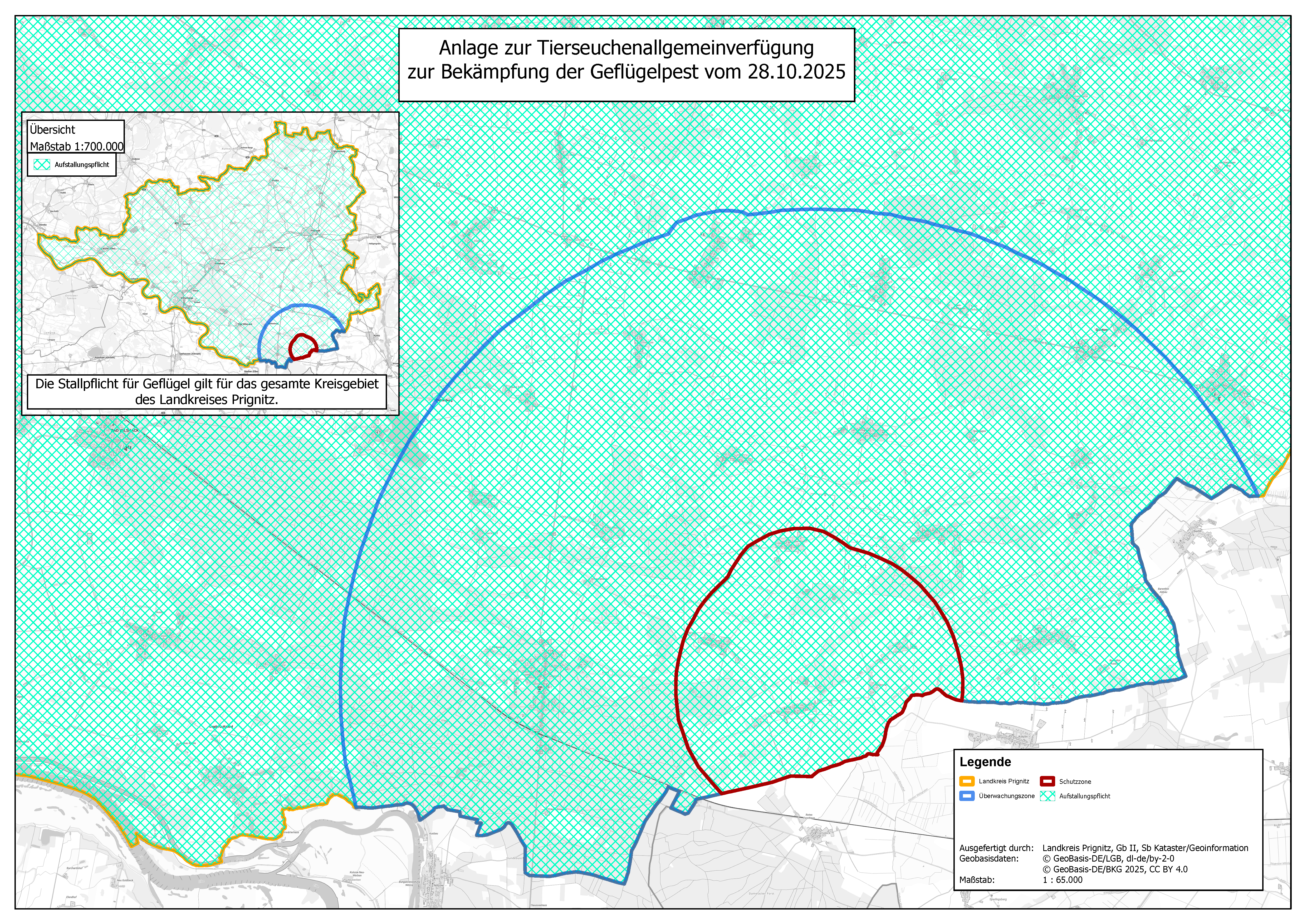 grün schraffiert > Stallpflicht (gilt für den gesamten Landkreis Prignitz)