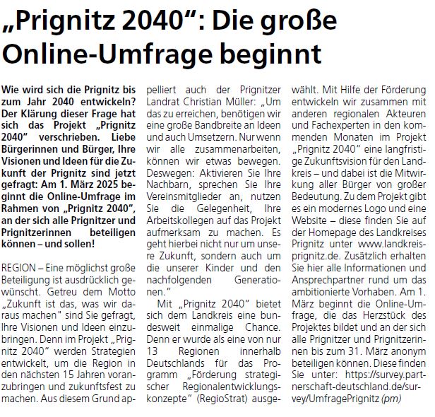 Am 5. Dezember 2024 hat der Kreistag dem Einsatz der Eigenmittel für die Umsetzung des Projektes Prignitz 2040 zugestimmt.