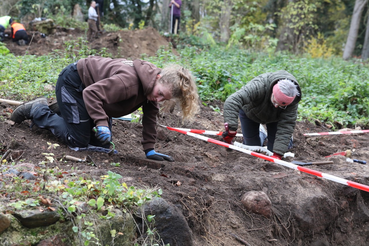 Das Besondere: Nicht nur die Studierenden des Erst-, Dritt- und Fünftsemesters sollten die Chance haben, in den Erdschichten nach Fragmenten alter Zeiten zu suchen, sondern auch Bürgerinnen und Bürger. Dafür waren die Schlossruine und die alte Motte – ein mittelalterlicher Burgtypus – prädestiniert, erklärt der Kreisarchäologe Torsten Geue. „Egal wer man ist, egal wie grobmotorisch man vielleicht veranlagt ist, die 1,5 Meter breiten Mauern an der Schlossruine sind so massiv, da kann jeder dran arbeiten und sich ausprobieren, ohne Angst haben zu müssen, Fehler zu machen.“