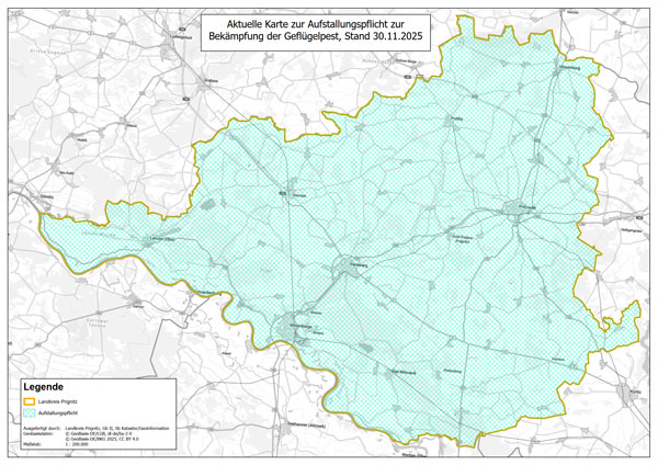 grün schraffiert > Stallpflicht (gilt für den gesamten Landkreis Prignitz)